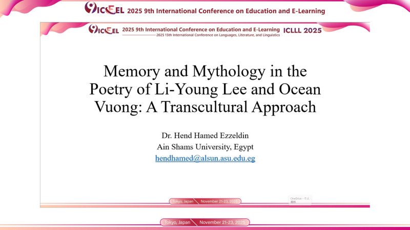 Invited Speech 6-Online: Asst. Prof. Hend Hamed, Ain Shams University, Egypt, presented "Memory and Mythology in the Poetry of Li-Young Lee and Ocean Vuong: A Transcultural Approach," analyzing cross-cultural literary creation.